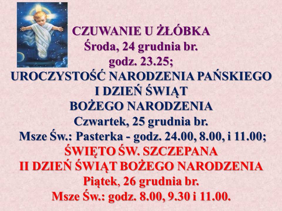 Msze Św.: Pasterka – godz. 24.00, 8.00, i 11.00;