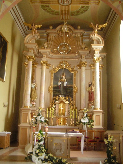 Ołtarz główny pochodzi z XIX w. i zbudowany jest w stylu renesansowym. Na szczególną uwagę zasługują figury świętych Apostołów Piotra i Pawła oraz obraz św. Stanisława Biskupa na tle Krakowa.